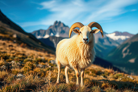 Sheep on the background of the mountains. Animal in the mountains