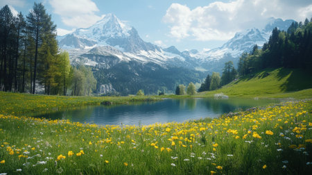 A tranquil moment unfolds as flowers bloom around a clear lake, with the majestic Swiss Alps towering under a bright blue sky.
