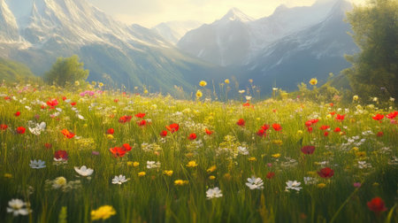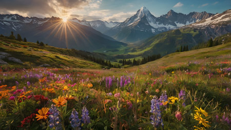 Vibrant alpine meadow filled with wildflowers and bees against a stunning mountain backdrop