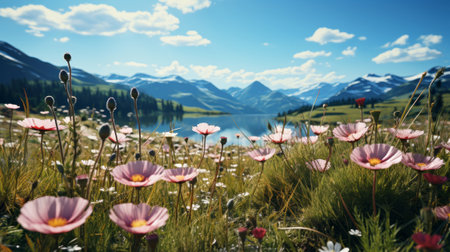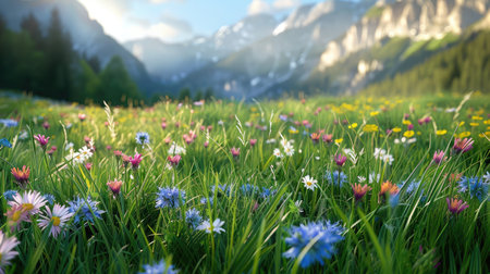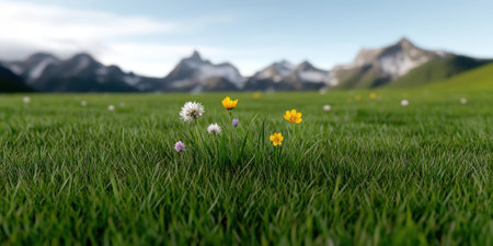 A serene landscape showcasing vibrant wildflowers blooming amidst lush green grass with majestic mountains in the background, capturing the essence of nature's beauty.