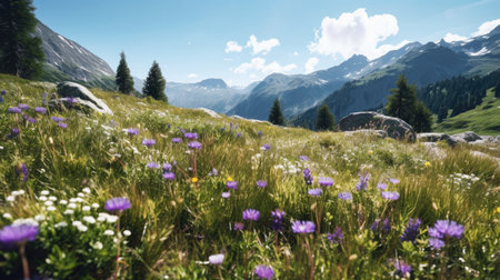 Wildflowers growing in an alpine meadow. Generative AI