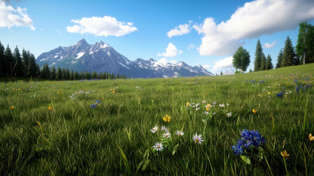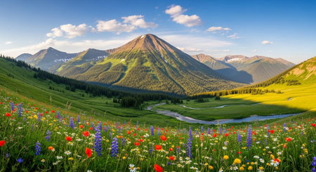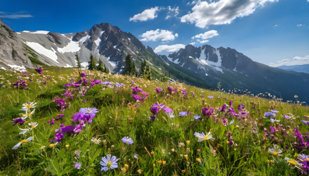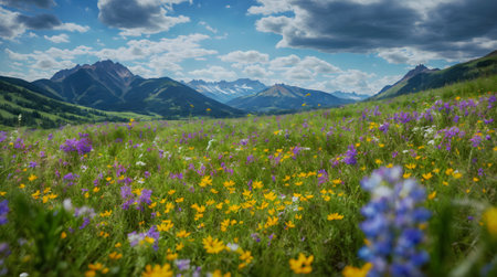 Wildflowers Meadow Mountains Colorful wildflowers blooming in a sunny mountain meadow with green grass and distant mountain peaks under bright sunshine