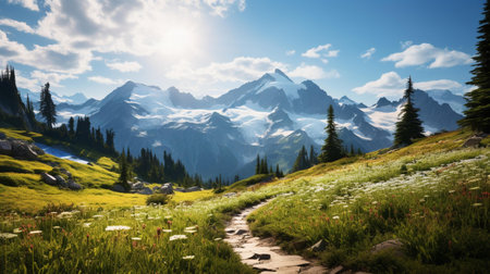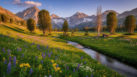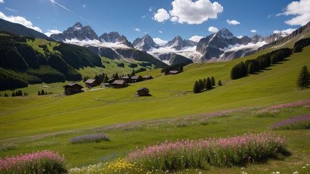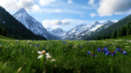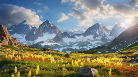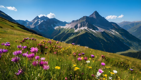 Mountain Landscape in Summer with Snowy Peaks and Wildflowers