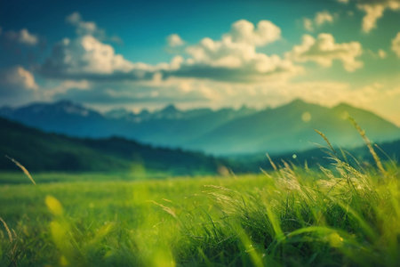 a grassy meadow with mountains and the sky in the background, captured in the romantic soft focus and ethereal light style. this nature-inspired photograph showcases the beauty of the landscape, with motifs of flora and fauna. taken with a rollei prego 90, the image features a light cyan and bronze color palette. discover this eco-friendly craftsmanship on flickr. ai generated