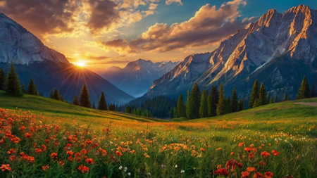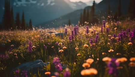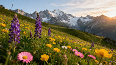 Vibrant wildflowers bathed in sunset light, an alpine meadow scene.