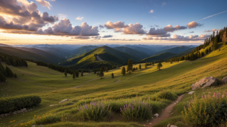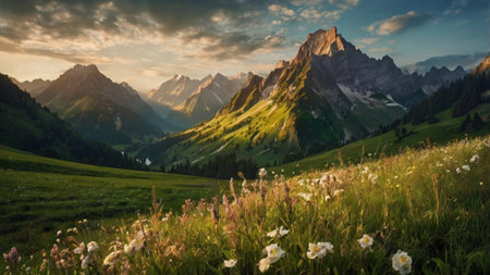 panoramic view of alpine meadow with wildflowers at sunset