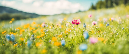 Beautiful wild flowers in a meadow, nature landscape, copy space.