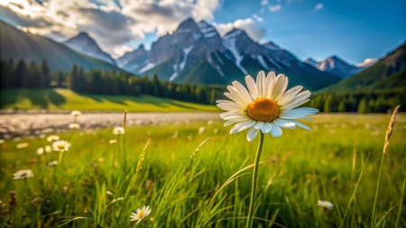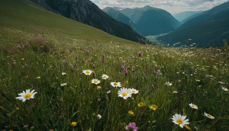 A vibrant field of daisies thrives in a lush green mountain meadow with a scenic backdrop of majestic mountains.