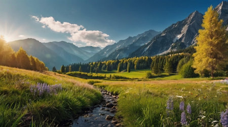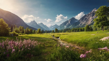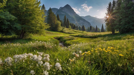 beautiful alpine meadow with blooming flowers and mountains in background