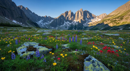 Empty alpine meadow at the base of jagged mountain peaks, filled with colorful wildflowers and scattered stones