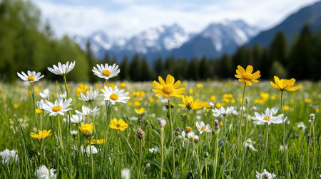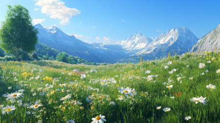 A lush meadow of blooming daisies contrasts beautifully with distant, snowy mountain peaks. AI Generative