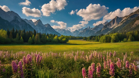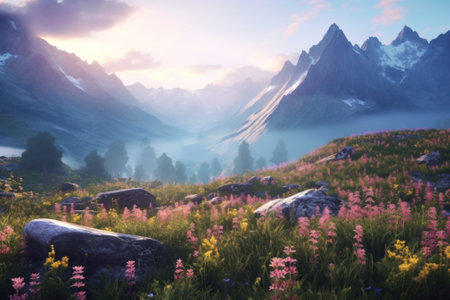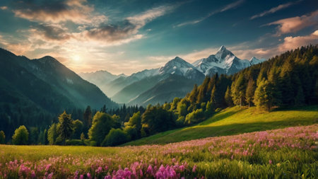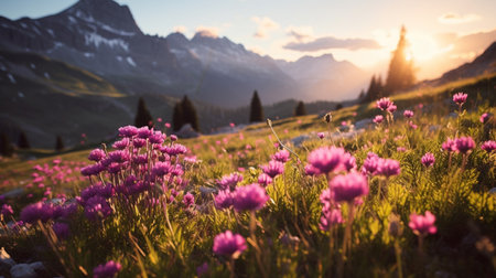 Tranquil and serene alpine meadow with vibrant pink wildflowers blooming at sunset amidst the stunning mountain range. Perfect for travel destinations and outdoor nature photography