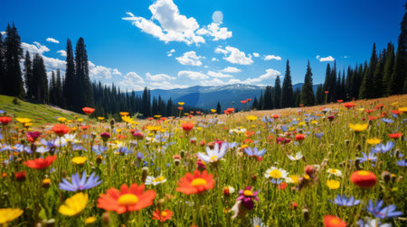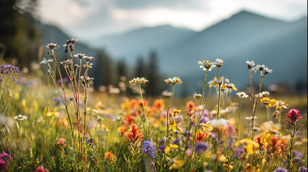 A Richly colored wildflowers blooming in meadow with mountains