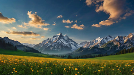 panoramic view of alpine meadow with yellow flowers and snow-capped mountains