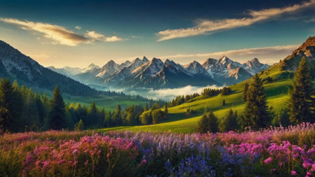 Peaceful scenery of a flowering meadow and mountain peaks