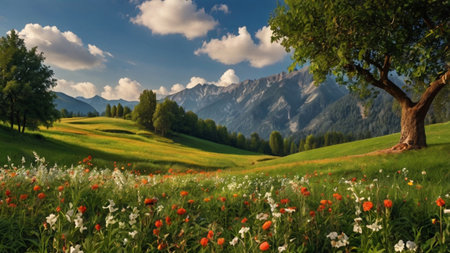 Meadow with flowers and tree in the background of mountains.