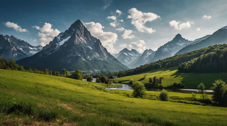 Beautiful alpine landscape with snow-capped peaks in the background
