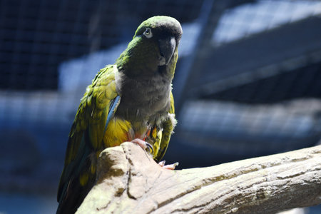 Parrot sitting on a branch in the aviary of the zoo