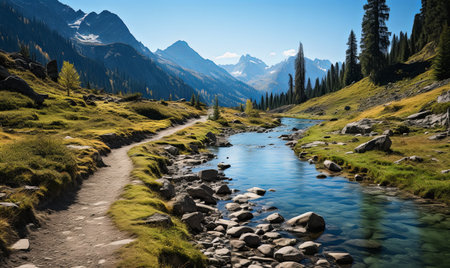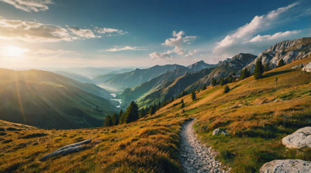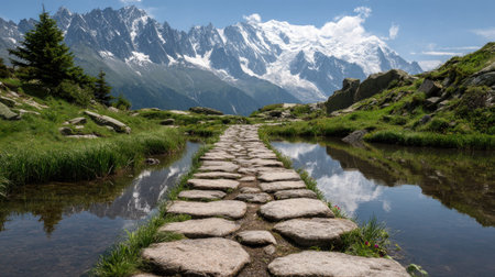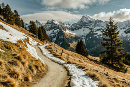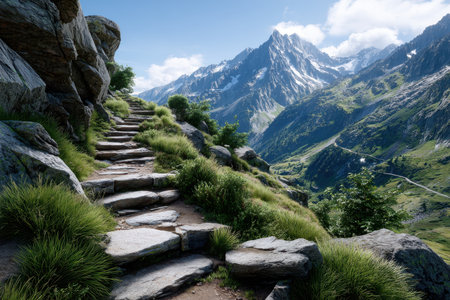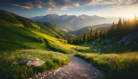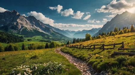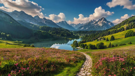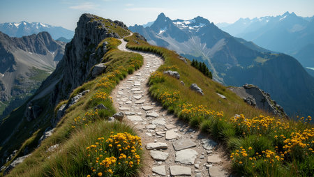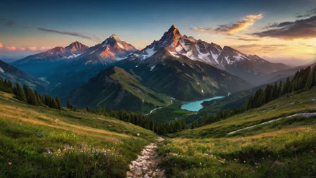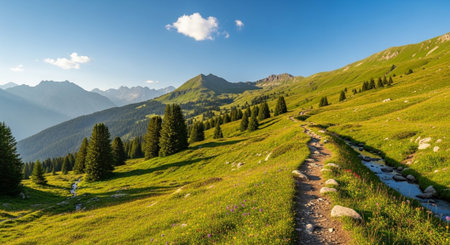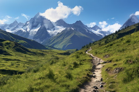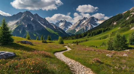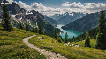A scenic hiking trail winds through a stunning alpine landscape, offering breathtaking views of majestic mountains and lush greenery.