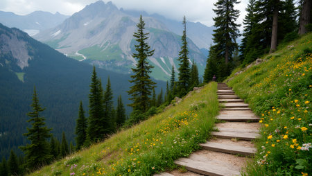 Scenic mountain trail with wooden steps alpine flowers and evergreens