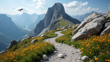 Scenic mountain trail with wildflowers boulders and eagles circling overhead
