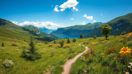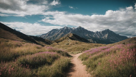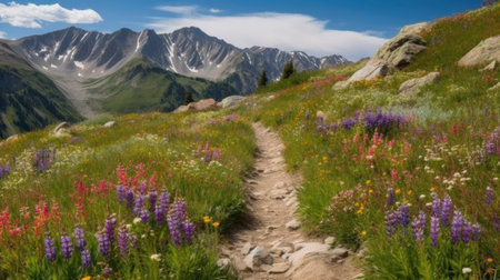 A winding dirt path leads through a lush mountain valley teeming with a diverse array of wildflowers in vibrant colors, including purple, yellow, and white blooms. Surrounded by abundant green grass and foliage, the scene offers a picturesque and serene natural vista, outdoor exploration.