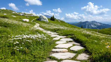 Scenic hiking trail in the Alps, featuring a stone path meandering through a vibrant meadow filled with wildflowers, against a backdrop of dramatic peaks and a clear blue sky