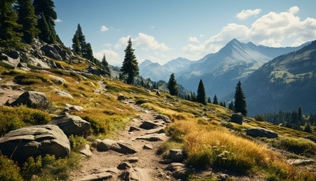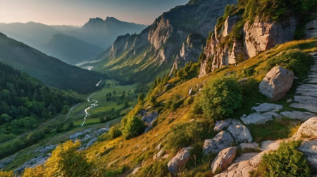 Rugged Swiss alps path landscape. Nature grass. Generate AI