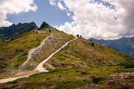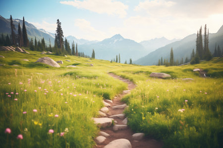mountain hiking trails, summer adventures await on hiking trails winding through vibrant green meadows of the mountains
