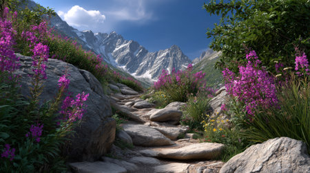 A picturesque mountain trail winds its way through a vibrant alpine landscape. Large, grey rocks line the path, interspersed with lush green grass and a profusion of bright purple and pink wildflowers. In the background, majestic snow-capped mountains rise against a clear blue sky dotted with fluffy white clouds. The scene evokes a sense of adventure and natural beauty, perfect for outdoor enthusiasts and nature lovers.