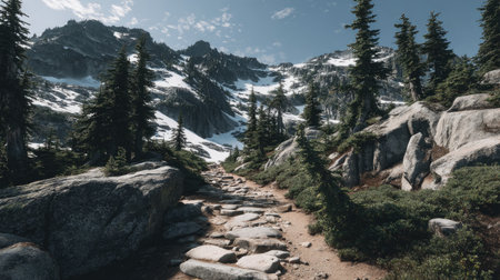 A breathtaking view of a rocky mountain pathway surrounded by lush pine trees and snow-capped peaks. Perfect for nature enthusiasts and adventurers.