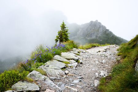 A mountain trail covered in mist, with plenty of space for text in the foggy background