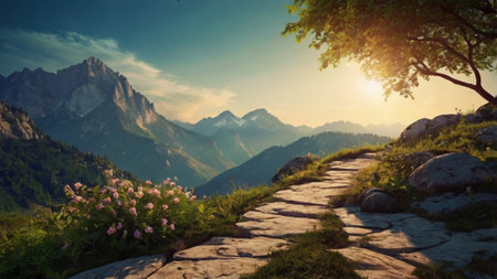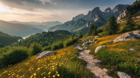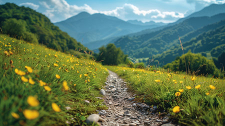 This illustration captures a peaceful mountain path lined with an array of colorful wildflowers in shades of purple, yellow, and pink. The scene is bathed in soft, warm light, enhancing the tranquil mood and inviting the viewer into a serene natural environment. Ideal for use in wellness and relaxation-themed projects. AI-generated illustration.