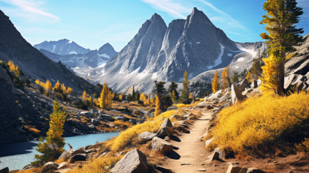 the majestic mountain landscape unfolds along a winding hiking trail, bathed in a warm, golden light, with strong shadows accentuating the rugged terrain, as vibrant hues of yellow, blue, pink, and black blend in harmony, evoking a sense of poetcore serenity, reminiscent of ansel adams' iconic photography and andrew tischler's illustration style. ai generated