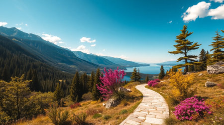 A picturesque mountain pathway winds through an array of vibrant flowers, leading to breathtaking peaks under a clear blue sky. Perfect for nature lovers and adventurers.