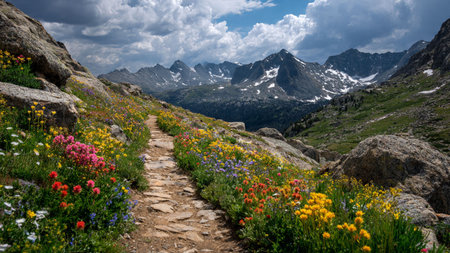 A stunning view of a winding stone path leading through vibrant wildflowers, set against majestic mountains and a dramatic sky, inviting adventure.