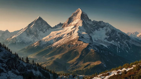 Beautiful mountain landscape with snow-capped peaks at sunset.