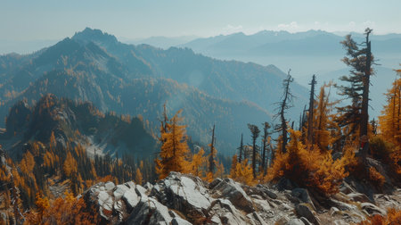 An aerial perspective reveals multiple layers of mountain ranges at sunrise, with hazy valleys and sunlit peaks under a soft sky.