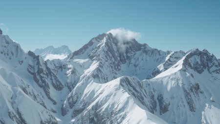 Snowy mountain range blue sky sunlight dramatic landscape peaceful remote winter natural beauty outdoor adventure