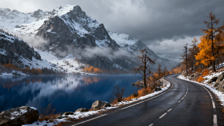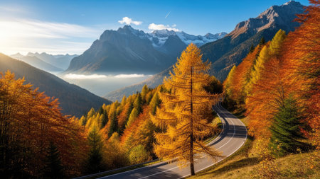 Under showing winding mountain road through a vibrant autumn forest with snow-capped peaks in the distance under a...