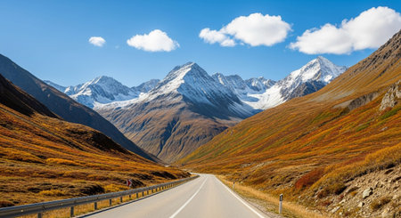 A paved road winds through a mountain valley during autumn. The hillsides are covered in vibrant golden and brown foliage, contrasting with the distant, snow-capped mountain peaks under a clear blue sky dotted with fluffy white clouds. A metal guardrail lines the left side of the road, and a small signpost is visible on the right. The scene evokes a sense of travel, adventure, and the serene beauty of high-altitude nature.