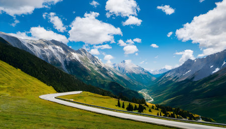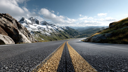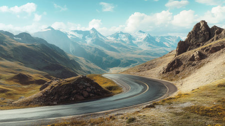 Capture the essence of adventure with this scenic image of a winding mountain road. The clear sky and snow-capped peaks create a breathtaking backdrop for exploration and tranquility.