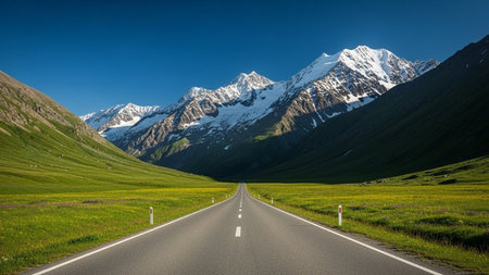 Scenic Straight Road Leading to Snow-Capped Mountains in Green Valley Landscape
