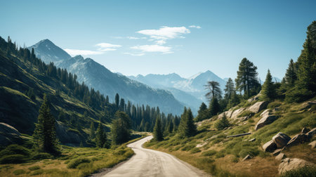 A stunning view of a winding road meandering through a mountainous landscape under a clear sky, capturing the essence of serene adventure and exploration.