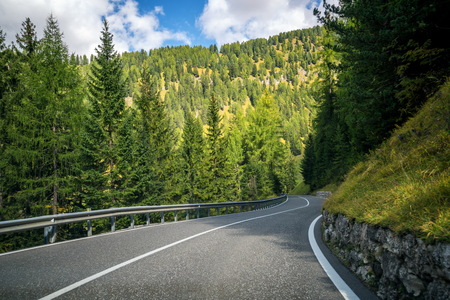 Beautiful mountain road with trees, forest and mountains in the backgrounds. Taken at state highway road of Dolomites mountain in Italy.