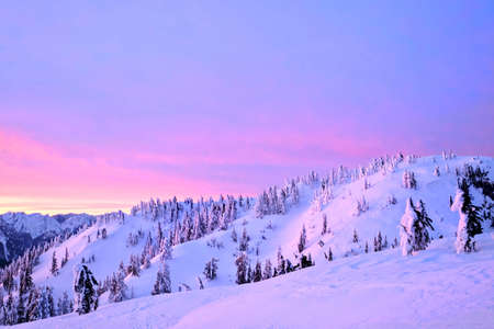 Travel Vancouver. Skiing in Mount Seymour Provincial Park in winter at sunset. North Vancouver. British Columbia. Canada.