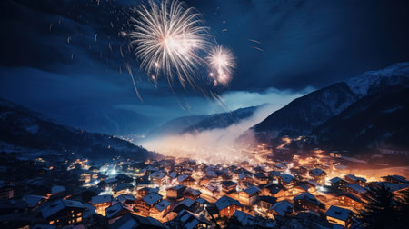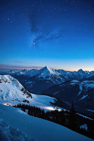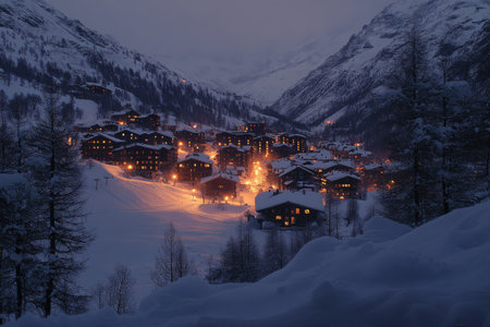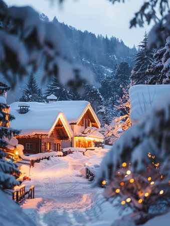 A mountain village twinkles under the evening's holiday lights, its snowy peaks creating a magical backdrop for the winter festivities.