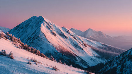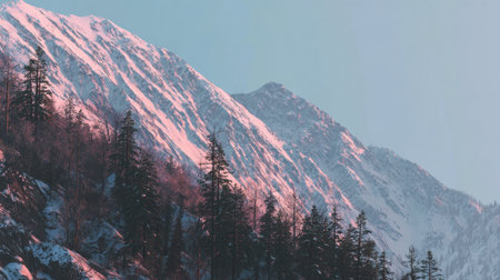 Majestic mountain landscape featuring snow capped peaks and evergreen trees. soft pink hues of sunset create serene atmosphere, inviting exploration and adventure