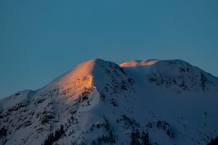 View of Alps in Kranjska Gora at sunrise. The tops of the mountains are covered with snow. Triglav national park. Slovenia, Europe