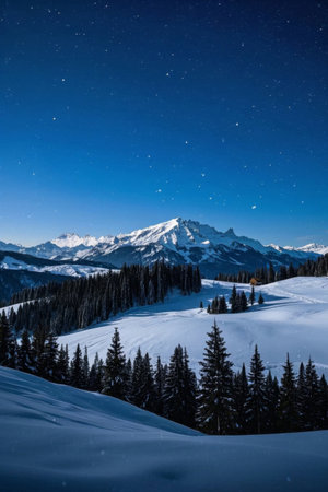 Winter landscape with snow covered trees in front of mountains and starry sky